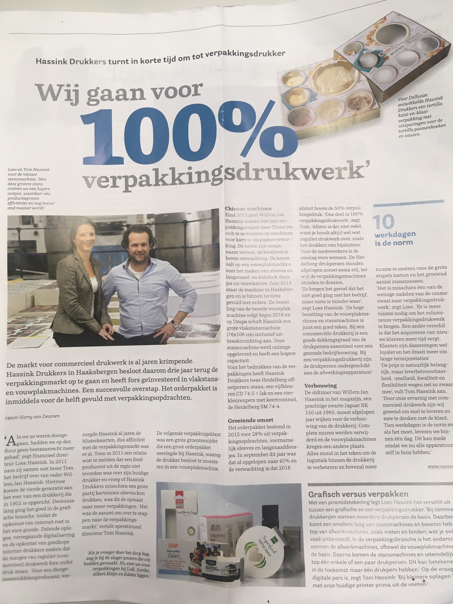 De productie van vouwkarton verpakkingen is een groeimarkt. De markt voor commercieel drukwerk is al jaren krimpende. Hassink Drukkers in Haaksbergen besloot daarom drie jaar terug de verpakkingsmarkt op te gaan en heeft fors geïnvesteerd in vlakstans- en vouwplakmachines. Een succesvolle overstap. Het orderpakket is inmiddels voor de helft gevuld met verpakkingsopdrachten.